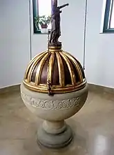 Está estructurado en tres cuerpos de cinco calles con sus propios basamentos y frisos respectivamente recogiendo una iconografía representada por escenas de algunos milagros de Jesús como la curación del paralítico, la resurección de Lázaro o la curación de un endemoniado.[4]
