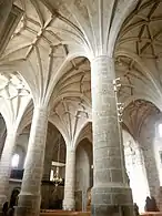 El interior es de planta de salón, con tres naves cubiertas en todos sus tramos con bóvedas de crucería estrellada. Conserva importantes retablos, tallas, pinturas y una colección de orfebrería litúrgica de plata, de los siglos XVI y XVIII. Son de destacar La Piedad, de Francisco de la Maza, (considerada entre las mejores obras de este discípulo de Juan de Juni), dos retablos (el mayor, plateresco, y el de la Resurrección, renacentista), así como una cruz procesional labrada en plata.