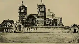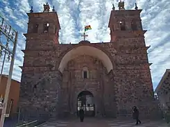 La iglesia, que está ubicada al norte de la plaza principal del pueblo, fue construida a finales del siglo XVI. Cuenta con dos torres con campanario, una entrada con un arco de medio punto y dos columnas salomónicas, y está construida enteramente en piedra andesita. Se afirma que muchas de las piedras fueron tomadas de las edificaciones de la cultura Tiahuanacu ubicadas en las cercanías.[1]