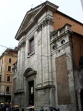 Su fachada, obra de Carlo Rainaldi, es de travertino y ladrillo. El portal de entrada único está rematado por un tímpano de luneta y una ventana rectangular; está flanqueado por cuatro pilastras corintias, que sostienen el entablamento con la inscripción Iesu et Mariae, y un gran tímpano triangular de remate.