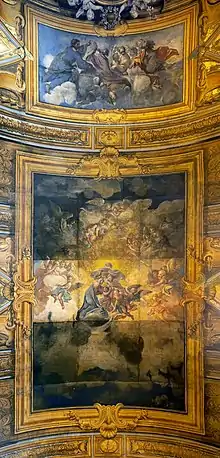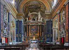 Es de una sola nave, con bóveda de cañón y tres capillas a cada lado. Mide 27 metros de largo y unos 15 metros de ancho; la capilla que conforma el altar mayor mide 7 metros por 7. [4] La bóveda fue decorada por Giacinto Brandi con un lienzo que representa la Glorificación de la Virgen con los cuatro evangelistas ; en la cornisa de la bóveda hay estatuas de estuco que representan a los profetas y otros personajes del Antiguo Testamento .