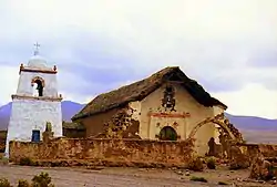 Cuenta con una nave, con muros construidos con piedra en bruto asentada en barro, apoyados con tres contrafuertes por lado. La techumbre es de dos aguas en madera cubierta con paja brava. Presenta un campanario de dos niveles y un atrio conformado por un muro de piedra y adobe.[1]