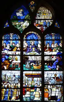 - Los vitrales del siglo XV son aún más famosos. Adornan cuatro vanos en los dos últimos tramos gótico-renacentistas de la fachada occidental . Otras dos vidrieras renacentistas también decoran las ventanas inferiores de la fachada oeste. Provendrían quizá de Ruan, de los talleres de Arnoult Nijmegen (Arnold van Nijmegen), artista del vidrio holandés que también diseñó las vidrieras de la iglesia Sainte-Jeanne-d'Arc de Rouen.[3] En su mayoría representan escenas del Antiguo Testamento o de la vida de Cristo: Jesús y la samaritana junto al pozo de Jacob, Moisés y la travesía del mar Rojo por los hebreos, la última cena, los Reyes Magos, la vida de San Juan Bautista y un árbol de Jesse. Se constata que el maestro vidriero en la representación del paso del mar Rojo supuso el mar y sus olas de color... ¡rojo!