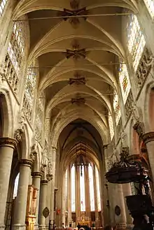 La fecha exacta del inicio de la construcción de la iglesia que sustituyó a una antigua capilla anterior no se conoce con certeza, aunque se acepta generalmente que fue alrededor del cambio del siglo XV. El proceso de construcción entero tomó cerca de un siglo. El coro se terminó en 1435, como atestiguan las pinturas murales de esa fecha. Las obras fueron interrumpidas debido a las dificultades después de la muerte de Carlos el Temerario en 1477, pero se reanudaron a finales de siglo. La nave finalmente tuvo siete tramos, y los dos últimos deberían haber estado coronados por una torre que nunca se terminó. El sagrario construido detrás del coro data de 1549. A finales del siglo XVI la iglesia fue saqueada por los calvinistas y la estatua de la Virgen que Beatrijs Soetkens había llevado fue destruida.[5]