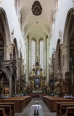 En el este la iglesia termina con un presbiterio corto de forma rectangular acabado con 4 lados del octángulo. Las ménsulas del presbiterio contienen los bustos del rey Wenceslao IV y de la reina. Las naves laterales terminan en las capillas poligonales de 5 lados del octángulo. Las naves laterales poseen 5 campos de la bóveda de arista de plano cuadrado con el perfil periforme a la que cada una se une a la bóveda de crucería. La nave principal y el presbiterio tienen 6 campos de la bóveda barroca de cañón.