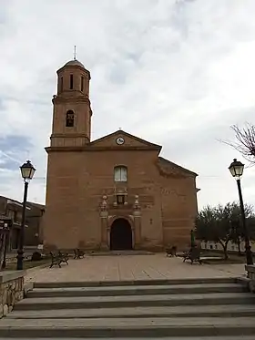 La torre campanario es de tres cuerpos; los dos primeros rectangulares y el tercero ochavado, con un remate en forma de casquete semiesférico.[1][2]