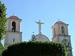 Detalle de la escultura del Sagrado Corazón entre la torre de campanas (izquierda) y la torre del reloj