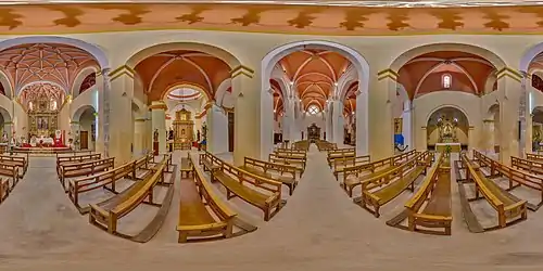 Originalmente se trataba de una iglesia gótico-mudéjar de los siglos XIV y XV con tres naves, mayor la central, y tres tramos cada una, cubiertas con bóveda de crucería y rematadas por un testero recto. En el siglo XVI se amplió la nave en un tramo, se sustituyó la cabecera recta por un ábside poligonal, se reformó el crucero y se construyó la torre que se alza en su ángulo suroccidental.