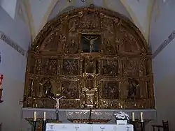 El retablo mayor es el mejor exponente del estilo clasicista de toda la comarca. Fue ensamblado por Nicolas de Pierres, hijo de Pierres de la Chapela, antes de finalizar el siglo XVI, pues un documento cuenta que en 1.601 ya estaba terminado. Consta de cinco calles separadas por columnas acanaladas en espiral rematadas por capiteles jónicos. Todos los retablos y especialmente el Retablo Mayor fueron restaurados cuidadosamente hace cuatro años.