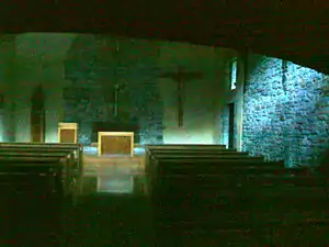 El muro constituido de bloques de areniscas tallados a azuela con la ventana de estilo mozárabe pertenece a este edificio y fue reutilizado en el nuevo templo.
