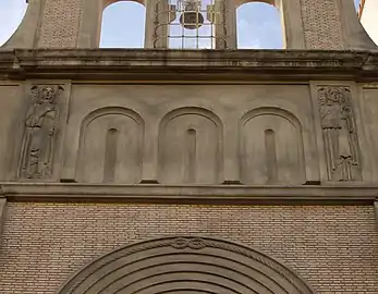 La fachada está adornada por tres figuras construidas en cemento: San Antonio de Padua, encima del acceso principal, cuya iconografía le representa con el Niño Jesús en brazos, obra del escultor Áureo Rebolé; en la puerta secundaria, más al sur, Santa Teresita de Lisieux, con los Evangelios abiertos y un ramo de flores; y, por último, en el chaflán, la imagen de San Francisco de Asís sobre la puerta de acceso al convento obra de Ramón Arcaya que ya había realizado pocos años antes otro monumento a San Francisco de Asís en Pamplona. Se da la circunstancia de que es la última escultura que realizó este artista.