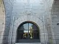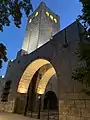 La base de la torre arranca de un pórtico formado por cuatro grandes arcos de medio punto, que configuran el acceso monumental al recinto. La entrada a la torre se sitúa entre los dos arcos centrales del pórtico, más separados que los laterales para configurar un espacio de acogida. Frente a dicha entrada se dispone un espacio ajardinado cuyo diseño geométrico continúa las líneas compositivas del pórtico. La torre-osario y el pórtico se revisten exteriormente con grandes bloques de granito que dotan al conjunto de una apariencia solemne y acorde con su carácter castrense.