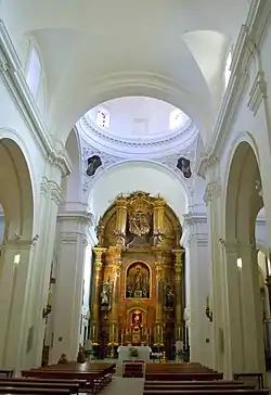 La iglesia presenta planta de cruz latina, con tres naves separadas por pilares cruciformes y coro en alto a los pies. A los costados de las naves y junto a la cabecera se adosan una serie de capillas y dependencias, de menor alzado que el cuerpo principal para permitir la iluminación de éste. La nave central, de doble anchura que las laterales, está cubierta por bóveda de cañón con lunetos y arcos fajones, mientras que las laterales poseen bóvedas de arista. Este esquema se modifica en el crucero, pues mientras que los tramos laterales utilizan la bóveda de cañón con lunetos, en el central se alza una cúpula sobre tambor.