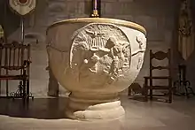 En esa misma capilla, a los pies del Cristo, vemos una pequeña pila bautismal de estilo renacentista en la que se encuentra un relieve perteneciente a la escena del bautismo de Jesús. A su vez, en el lateral izquierdo de la misma, aparece un pequeño retablo pintado sobre madera del que se desconocen autor y año. Este retablo presenta, entre otras, la escena del Descendimiento de la Cruz y la primera aparición de Jesús a sus discípulos tras su resurrección. En la esquina inferior derecha de la primera de ellas, se puede ver un inscripción que versa "S. MERENC", y que podría informar sobre el autor original.