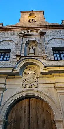 La portada de la iglesia es de piedra, muy sencilla con arco de medio punto, que acoge en su vano el escudo de los Pérez de Meca Ponce de León. El escudo cuartelado se divide por la cruz de Santiago y está enmarcado por hojas de acanto, labradas en movimientos envolventes típicos de este periodo artístico. Por su parte, el cuerpo superior se limita a los dos vanos de las ventanas y la hornacina central dónde se ubica una imagen en piedra de San Diego. La fachada remata en un armonioso frontón coronado por una espadaña para las campanas.