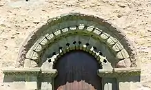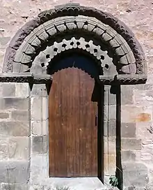La portada principal, también llamada «pórtico de la gloria», orientada a occidente, está compuesta por un arco de medio punto con dos arquivoltas que se apoyan en dos pares de columnas apoyadas en sendas basas decoradas con hojas, un par a cada lado y guardapolvo superior, también llamado «polsera». El guardapolvos de esta iglesia, que en este caso también tiene la forma de arco de medio punto y carente de tejaroz, está decorado con taqueado jaqués o ajedrezado, que es un tipo de ornamentación basado en pequeños cilindros alineados que se encuentra en edificios románicos, tanto en frisos como en arquivoltas de puertas y ventanas. Otros nombres que se dan a esta decoración son «ajedrezado», «billetes», «tacos», «escaqueado» o «dados».[13]