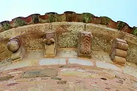 Más concretamente, existen los siguientes subtemas y representaciones: «figuras geométricas» en los canecillos 1, 19, 20, 21, 23 y 24; «figura humanas» en el 2 que tiene un hombre con un libro, el 3 tiene un músico, el 4 es una danzarina, el 5 una pareja humana, el 6 un monje leyendo un libro, el 8 una figura de mujer, el 12 una cabeza humana de gran calidad de talla y el 15 un hombre con un tonel; «figuras de animales» el 9 es un gato, el 10 un animal indeterminado, el 13 dos serpientes enroscadas, los 14, 16, 17 y 22 son animales no muy definidos cuya figura está muy estilizada, el 18 es un oso; «figuras de monstruos» el 7 y el 11 representan sendos dragones. Todo el conjunto se apoya en una hilada de piezas de sillería muy bien escuadradas que rodea todo el ábside a efectos de darle un mayor realce.[29]