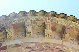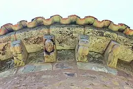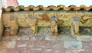También dispone de veinticuatro metopas y dos medias metopas labradas en bajorrelieve con motivos geométricos, alternadas con los veinticuatro canecillos altamente cinceladas. Los canecillos, aunque esculpidos en altorrelieve con motivos diferentes, tienen una cierta relación entre algunos de ellos, por ejemplo los temas laicos festivos como son las de un juglar tocando un instrumento de cuerda que bien pudiera ser una vihuela y otro personaje dando una voltereta. Hay otra serie de ellos que tienen como tema común la componente erótica como son los de una pareja abrazada y una mujer mostrando sus genitales; otro grupo tiene como nexo de conexión el que representan figuras zoomórficas así como motivos vegetales geométricos.[22][27]