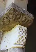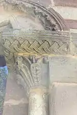 La parte inclinada de la imposta que supera este capitel está decorado mediante dos cintas onduladas que se entrelazan; una de ellas está formada por hojas de gran tamaño y la otra, más sencilla, consiste en una cinta estrecha, con bordes remarcados y pequeños listoncillos perpendiculares a los bordes, muy cercanos unos de otros; la parte superior, vertical, tiene dibujos bastante deteriorados casi inidentificables. El capitel colindante, situado más hacia el interior, está decorado con hojas y motivos de cestería. La parte inclinada de la imposta de este capitel es muy similar a la anterior, pero una de las cintas tiene las flores de menor tamaño que el anterior por lo que ambas cintas dejan unos huecos en el entrelazado que lo ocupan distintas tallas de hojas. La parte vertical, mejor conservada que la anexa, está decorada por semicírculos apuntando hacia abajo y unidos por sus diámetros.[11]