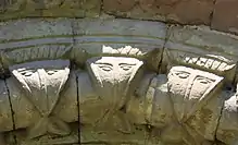 Los capiteles están decorados con motivos vegetales, a los que se unen cintas. El capitel más exterior representa una gran cabeza humana mordiendo una hoja de las que están dentro de una cesta y es tan grande que casi ocupa toda la cesta y que, por su similitud, puede tener cierta relación con el románico atlántico.[11]