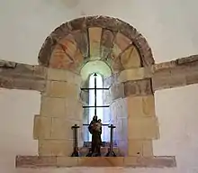 En el centro del ábside hay una ventana larga y estrecha bajo una arquivolta flanqueada por dos columnas que terminan en capiteles decorados a cincel con motivos florales. Coronando la ventana y bajo el guardapolvos hay una figura geométrica que es la mitad de un dodecágono estrellado. El guardapolvo está decorado fundamentalmente con hojas dentadas.[22]