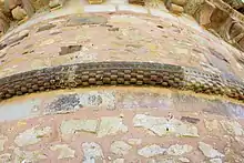 El guardapolvo está formado por cinco piedras de tono rojizo y decoración similar a la de la imposta exterior del lado derecho del pórtico a poniente, es decir con unos temas vegetales que simulan una cortina colgante.[31]