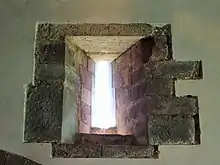 En el muro sur hay tres saeteras, también llamadas «arqueras», «lanceras», «troneras» o «ballesteras»; las dos extremas tienen derrame al exterior mientras que la central, más estrecha, tiene derrame al interior, un pequeño arco semicircular y se apoya en una basa de una sola pieza muy bien trabajada. Respecto al guardapolvos, está decorado por hojas trifoliadas rodeadas de unas cintas de forma circular, similar a las impostas que tienen unos círculos en los que están inscritas ramas trifoliadas y tetrapétalos.[11]