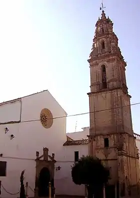 Lo más importante del conjunto es el patio de entrada rodeado de cadenas, la capilla lateral neobarroca de la Inmaculada Concepción del Voto (patrona de la ciudad), un cristo de la Buena Muerte del sevillano Antonio Castillo Lastrucci, copia del de la Buena Muerte de Sevilla de Juan de Mesa, las dos portadas de piedra y la gran torre barroca de ladrillo (33 m) construida en el siglo XVIII, de cinco cuerpos. El primero es prismático y sobre este se alza otro de planta menor y sobre éstos, tres cuerpos de campanas más estrechos. Los últimos cuerpos manifiestan un enorme parecido con los que rematan la torre de la Catedral-Mezquita de Córdoba (1664).