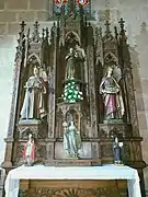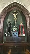 La capilla situada en el lado del evangelio, anteriormente dedicada al Santísimo, está presidida por una talla de la Inmaculada Concepción obra de Pedro de Ávila, antes ubicada en la capilla de la epístola, la cual está actualmente destinada a rendir culto a San Lázaro. En el extremo izquierdo del transepto destaca un retablo neogótico sin policromar de un cuerpo y tres calles presidido por una imagen de San Francisco (anteriormente lo presidía la imagen de San Lázaro), ubicándose a la izquierda una estatua de San Luis de Francia y a la derecha una escultura de Santa Rosa de Viterbo, mientras que en el banco están dispuestas las tallas de San Blas, Santa Clara y San Benito. Este retablo presenta las tres imágenes superiores bajo doseletes compuestos por tres arcos ojivales y apoyadas a su vez en tres doseletes formados por tres arcos trilobulados, estando todo el conjunto coronado por chapiteles ricamente ornamentados. Respecto a la nave, en el lado del evangelio se encuentra emplazado un retablo con forma de arco ojival e imágenes en relieve de la Virgen del Carmen y San Francisco asistiendo a las ánimas del Purgatorio, mientras que frente al mismo, en el muro de la epístola, se halla un arco apuntado bajo el cual se custodia un calvario en el que las imágenes de la Virgen y San Juan, a diferencia de la de Cristo, son de vestir, si bien todas ellas se caracterizan por ser de bulto redondo.