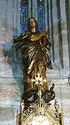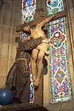 Además de las anteriores, la iglesia posee varias otras imágenes, como una talla de San José a la izquierda del retablo de San Francisco y una imagen del Beato Sebastián de Aparicio a la derecha del mismo. La estatua, la cual aparece sosteniendo una piedra con la mano derecha y una cruz con la mano izquierda, posee en la peana la siguiente inscripción: «S. SEBASTIAN DE APARICIO. NACIO ENLA DI/OCESIS DE ORENCE MURIO DE EDA DE 98 AÑOS». De igual modo, en el extremo derecho del transepto se disponen imágenes de San Antonio de Padua, el Sagrado Corazón y Santa Rita, destacando a su vez las 34 vidrieras de la iglesia, 31 de ellas obra de la Casa Maumejean instaladas por el arquitecto Daniel Vázquez-Gulías a comienzos del siglo xx[3] las cuales están decoradas en mayor medida con temas religiosos. Las tres restantes, adornadas con motivos geométricos, fueron realizadas a principios de la década de 1990 por la Unión de Artistas Vidrieros (Vitroluz, S.L.), pudiendo leerse en una de ellas: «VITROLUZ, S.L.- IRUN- ENERO 93».[14] Originalmente la luz entraba a través de los vitrales por el este, pero tras el traslado se varió la orientación, entrando ahora por el noroeste.