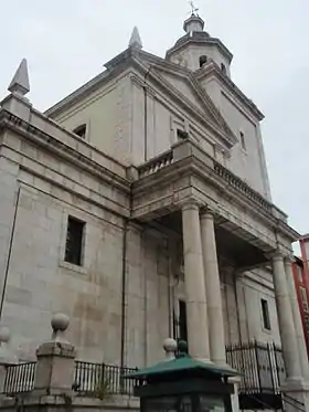 Un pórtico clásico se destaca, sobresaliendo de la fachada principal, con una balaustrada sobre el entablamento y un frontón triangular rematando el cuerpo superior. En el frontón aparecen unos pináculos, que junto a las bolas, típicas de Herrera, y a las cornisas resaltadas, son la única decoración exterior. La iglesia posee una potente torre prismática con un campanario octogonal abovedado, en referencia a la catedral de Valladolid.