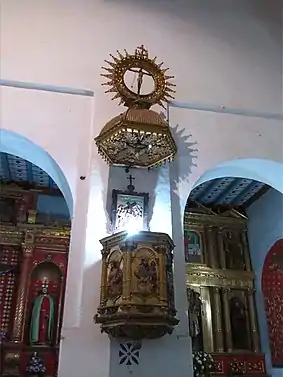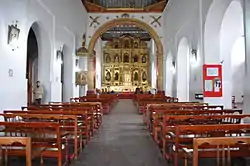 Hacia el interior la iglesia gira entre una austeridad franciscana y la estética de la restauración de 1992 con la conmemoración del V Centenario del Descubrimiento de América, donde destacan los grupos escultóricos del retablo mayor de San Francisco, de tres cuerpos y cinco calles con predela, el arco toral hojillado en oro y sobre grandes pilastras y capiteles corintios, el púlpito sobre el lado del Evangelio, el grupo escultórico de la Crucifixión, el Altar de los Pelícanos, en madera noble que es una de las mejores muestras iconográficas del simbolismo de la pasión de nuestro Señor y el camarín de la Inmaculada Concepción, con una profusión de decoración pictórica en vivos colores azules, blancos y rojos.