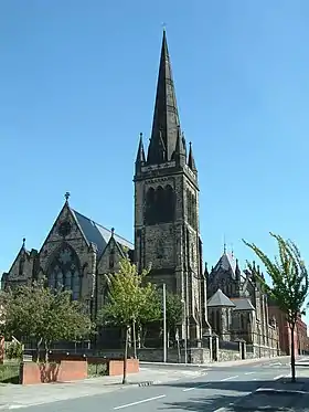 La iglesia está construida en piedra con techos de pizarra galeses. Su planta consiste en una nave de ocho vanos con pasillos norte y sur bajo techos a dos aguas separados, y un pequeño presbiterio de un vano con capillas al norte y al sur. Al suroeste hay una torre con una aguja y al sureste está la Capilla de la Sodalidad. Esta capilla es de planta poligonal con ábside en el oeste y una girola en el extremo este.[9][10]