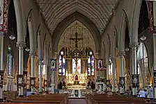 El altar mayor y los retablos son de piedra caliza blanca de Caen e incluyen arcadas y pináculos; fueron diseñados por S. J. Nicholl. En las capillas laterales, dedicadas al Sagrado Corazón y a Nuestra Señora del Rosario, hay altares y retablos similares. La pared lateral de la capilla del Sagrado Corazón también contiene una talla fina y de tamaño natural de Christus Consolator, una copia de la famosa pintura de Ari Schaffer. El púlpito está hecho de piedra de Caen y una elaborada fuente se sitúa en el extremo oeste de la nave debajo del desván del órgano.[11] Las vidrieras de la iglesia son de Hardman y Powell; las que estaban tras el altar mayor y en los altares de ambos lados fueron destruidos por la explosión de una cercana bomba incendiaria durante la Segunda Guerra Mundial y reemplazados en 1945. La ventana en el desván del órgano data de 1935 y las ventanas sobre la estatua de la Piedad (en la ventana de los Santos Ocultos), y debajo del desván del órgano, son de Linda Walton, con fecha de 1997 y 2000, respectivamente. También hay dos ventanas de los estudios Hardma, de los años 50, de San Nicolás y San Jorge cerca de la entrada de la calle Langsdale. Las vidrieras de la Capilla de la Sodalidad fueron diseñadas por Edmund Kirby y fabricadas por Burlison y Grylls.[12] Hay un anillo de ocho campanas emitidas en 1920 por John Taylor & Co.[13] que se volvieron a colgar en 2002-03. El órgano de cuatro-manos fue construido en 1849 por Gray & Davison y reconstruido y ampliado en 1907 por William Hill & Son.[14]