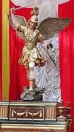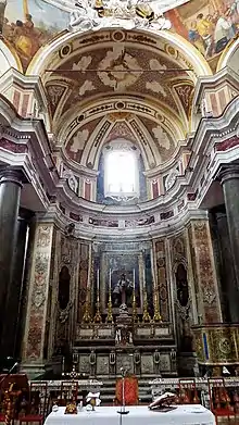 El alto altar, hecho por Marino Tarsia en 1735, representa la gloria del Cordero y los símbolos de los 4 evangelistas. Está coronado por un retablo que representa la Anunciación de la Virgen.