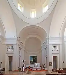 La fachada es de ladrillo y travertino; el portal central está coronado por una gran ventana en una luneta, sobre la cual el escudo de armas de Pío XI . La iglesia está enriquecida por una cúpula alta.