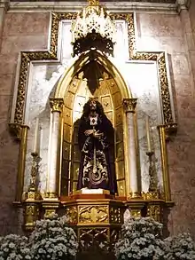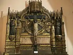 En la espaldera del Comulgatorio se ubica un retablo de madera con un Cristo crucificado, de estilo neogótico, flanqueado por las estatuas de dos santos. En la Sacristía se guarda una pequeña talla de madera de San Juan Bautista, que antes de la reforma litúrgica del Concilio Vaticano II se encontraba en el antiguo baptisterio, y una talla policromada de la Inmaculada, ambas realizadas con exquisito gusto. Una cabeza de San Francisco, copia de Murillo, realizada en el siglo XIX, completa la dotación.