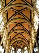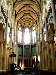 Consta de tres naves longitudinales, siendo la central más ancha y elevada que las laterales. Los pilares, que emergen sobre unas basa de mármol rojo de Ereño, son de sección cuadrada con unas columnas adosadas que culminan en capitales corintios. Sobre estas descansan los nervios que forman la crucería de ojivas que cubre las naves. En la nave central, los siete tramos se cubren con bóvedas barlongas, es decir, más anchas que largas. No presenta triforio y en su lugar el espacio superior de las paredes de la nave central, enmarcado entre las columnas de descarga, está ocupado por grandes ventanales vidriados.