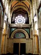 El exterior de la iglesia presenta en su fachada principal un rosetón central. Las torres gemelas que rematan su altura en flecha o aguja subrayan la verticalidad de todo el edificio. El atrio se encuentra situado en un plano elevado sobre el nivel de la calle; se accede al mismo por unas escaleras y lo cierra una verja trenzada de hierro forjado. El pórtico exterior se construye en arco de medio punto, con trasdós ligeramente apuntado.
