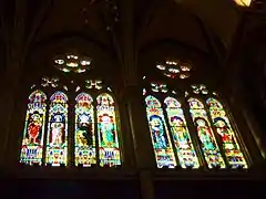 La iglesia posee una interesante colección de vidrieras policromadas repartidas por las diversas partes del templo. Su diseño y construcción se encargaron a una artesanía alemana de Múnich. Las más notables, por sus dimensiones y por la calidad de su colorido, se encuentran en las partes elevadas de todo el perímetro de las paredes. En el cuerpo central hay 17 juegos de vidrieras, 12 a ambos lados de la nave y las cinco restantes en el ábside. En total aparecen 52 figuras de santos y padres de la Iglesia, agrupados de cuatro en cuatro, salvo las más próximas al altar mayor, que forman sendos grupos de dos. Están enmarcadas en los espacios intercolumnarios formando ventanales de tracería bi y trilobulada.