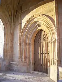 La portada, sin embargo, presenta formas góticas. Se trata de un arco levemente apuntado con arquivoltas en forma de media caña, sostenidas por grupos de finas columnillas con las basas y los fustes agrupados en haces; los capiteles, historiados, originan una especie de friso o banda que se prolonga hasta el salmer del arco. La iconografía de este friso es variada y críptica, de formas algo arcaicas: máscaras barbadas con sarmientos de vid saliendo de sus bocas, dos animales que parecen lobos o perros atacando a un tercero con aspecto de jabalí; otras figuras animales que pueden interpretarse como pájaros y ovejas; una flor de lis, un animal sin identificar regurgitando una gran hoja; y racimos de uva y más hojarasca estilizada. La portada se completa con un guardapolvo decorado con flores que surgen de un sinuoso tallo, y dos pilares cuadrangulares adosados, rematados en sendos pináculos, unidos por un friso de bolas.
