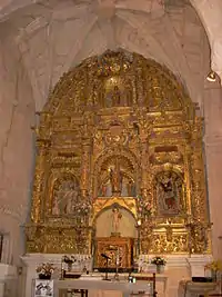 El retablo mayor es obra tardobarroca, colocado en la segunda mitad del siglo XVIII. Es un retablo de un solo cuerpo, banco y ático redondeado, con sencillas hornacinas y decoración muy profusa, de sabor rococó. Las imágenes, aunque no desentonan con el estilo del retablo porque fueron doradas y re-policromadas, son anteriores, de los siglos XV-XVI. Representan a san José con el Niño, san Miguel arcángel, los santos titulares de la iglesia Fructuoso, Eulogio y Augurio, y, rematando el conjunto, santa Lucía. Un bellísimo Niño Jesús Salvador del Mundo remata el sagrario. Es una escultura coetánea al retablo, de madera tallada y policromada, con ojos de cristal.