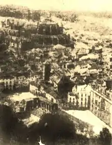 Vista de Plaza Nueva desde la torre de la Vela tomada antes de 1869 en la que se aprecia la iglesia de san Gil y las casas adosadas a ella antes de su demolición.