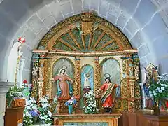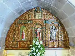 De un cuerpo con tres calles y ático semicircular, presenta policromía granate, verde y dorada, albergando en el centro, bajo un arco de medio punto y sobre el sagrario, una talla de San Ginés de Arlés caracterizada por un rostro imberbe, vestimenta de palio, un cuchillo en el cuello, una palma, una pluma y un tintero.[12] El resto de imágenes que adornan la estructura representan, bajo arcos de medio punto enmarcados por estípites rematados en pequeñas cornisas y todo ello cubierto de motivos vegetales en relieve, a San Juan Bautista a la izquierda y a San Roque a la derecha, hallándose un Cristo crucificado sobre una cruz de madera de chonta (regalo de Don Domingo) flanqueada por cuatro ángeles en el ático del retablo los cuales portan una escalera, una cruz, un cáliz y una lanza. Bajo el altar se conserva así mismo una imagen de Cristo yacente obra de Maximino Magariños Rodríguez custodiada dentro de una urna, regalo del alcalde de Sangenjo Don Ramón Orge Pérez. Todas las tallas del retablo son del siglo XVIII a excepción de la imagen de San Roque, de factura moderna la cual sustituye a una estatua del mismo santo gravemente deteriorada y por ello retirada del culto. El retablo reemplaza a su vez a uno anterior fechado en el siglo xvii e incendiado durante un ataque inglés en 1720. Por su parte, la lámpara votiva suspendida de la clave del arco triunfal constituye una obra de orfebrería de principios del siglo xix cuya autoría corresponde al platero compostelano Francisco Pecoul.[11]