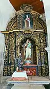 Frente al retablo de la Capilla de San José, detrás del cual se cree pueden permanecer ocultos varios frescos como en el caso de la Capilla de la Purificación,[15] se ubican una imagen de Nuestra Señora del Perpetuo Socorro y una estatua de la Virgen de Fátima, mientras que a la entrada del templo destacan tres tallas de madera las cuales representan a Santa Rosalía de Palermo, San Antonio de Padua y Nuestra Señora de los Dolores, estas dos últimas de vestir, siendo las más veneradas Santa Rosalía, la Virgen del Carmen y San Ginés, las cuales son sacadas en procesión durante sus respectivas festividades al igual que otras tallas, como la de San Roque. En la formación rocosa que constituye la base de la estatua de Santa Rosalía figura la leyenda hallada en una gruta el 25 de agosto de 1624 por dos albañiles que se encontraban trabajabando en el convento dominico de San Esteban de Quisquina: