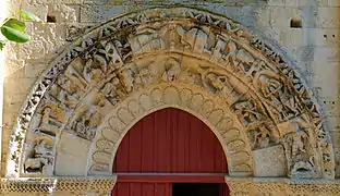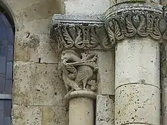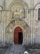 En el cuarto tramo de la nave lateral derecha, un portal muy bonito está decorado en el interior, lo cual es raro. Su arco está formado por 31 claves talladas. En el centro, un Cristo bendiciente con su mano derecha, sostiene en la otra mano el libro de la Sabiduría. A su derecha, san Pedro blande una llave, mientras que los otros personajes sostienen un libro. En fin, todos los capiteles del deambulatorio son notables y tienen una rica iconografía: una caza de jabalíes, el árbol de la ciencia del Bien y del Mal, una escena de malabares, aves bebiendo de una copa, dragones, quimeras, elefantes.