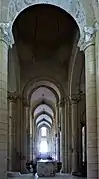 La decoración tallada es abundante: 282 capiteles románicos representan a músicos y monstruos (centauro sagitario, basilsicos, dragones...). Esa decoración es también particularmente rica en las naves laterales, cuyos muros están tapizados de anchos arcos geminados que descansan sobre columnas y que encuadran las ventanas en arco de medio punto.