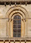 La fachada meridional: por encima del portal se extiende una cornisa con modillones historiados (símbolos de los Evangelistas) entre los que están tallados los signos del zodíaco.
