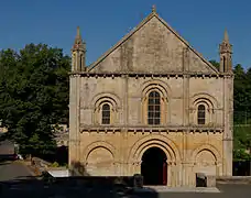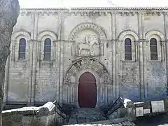 La fachada occidental esta rematada en las esquinas por dos manojos de columnas coronadas por elegantes y pequeños campanarioss con flechas. El portal central, con hastial a dos aguas, de tercer punto está flanqueado por dos arcos ciegos. Por encima, una banda de palmetas se apoya en grandes medallones tallados. Pasa por debajo de tres ventanas semicirculares ricamente decoradas.