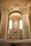 La cabecera se caracteriza por el escalonamiento de las cubiertas de los ábsides y luego del deambulatorio, y finalmente del coro que corona la torre del campanario. Es un modelo de equilibrio.